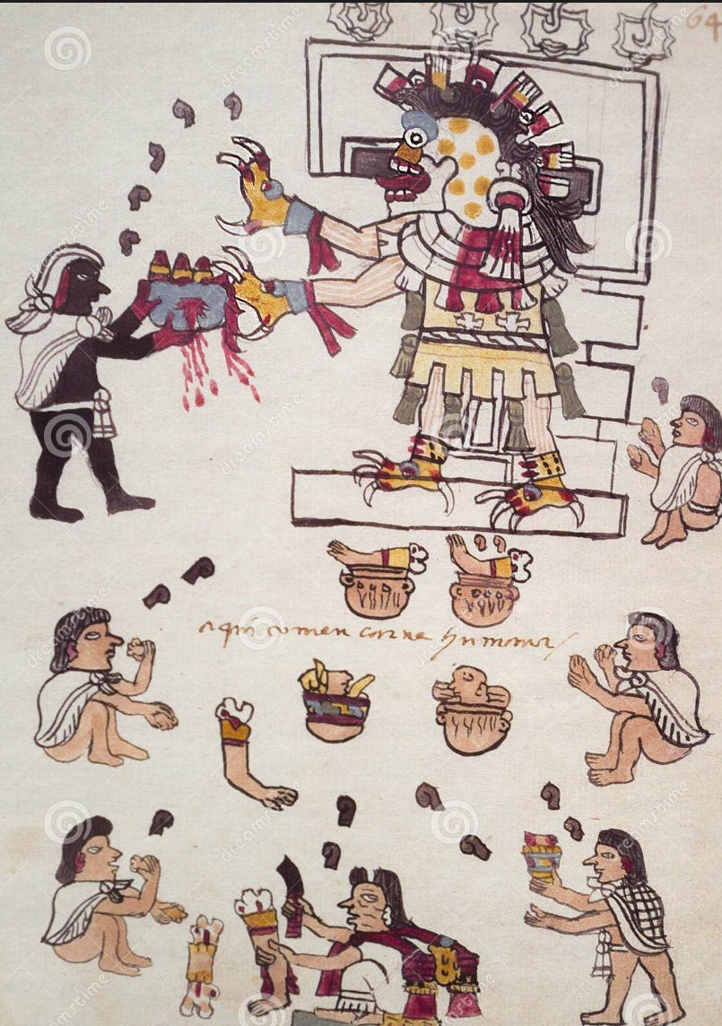 Several peoples of the American continent are widely believed to have consumed the flesh of enemies to absorb their virtues. The Zapotecs had a word meaning “a captive when they ate him”: “xoyaaquij.” In some communities, they also killed, and later ate, adulterous women2. The theory that this merely was an animistic practice fails to explain why slaves, in the Americas as elsewhere at the bottom of social hierarchies, were eaten: among the 2nd millennium Aztec/Mexicas, if slaves misbehaved they might be collared and sold – and, if this happened four times, they could be sacrificed and eaten. Spanish chroniclers in the 16th century noted that slave flesh was eaten during celebrations among the southern Zapotecs3.