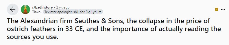 It is worth noting that, much like with A Knight's Tale, there is a grain of truth here. I copied out the passage from Tacitus here and you can tell there is a really striking "modernity" to the event. A credit crisis leading to mass insolvency that is solved by a "liquidity injection" by the emperor is a pretty compelling story for economic history, certainly in times when there are similar debates about the use of government to aid in financial crisis. That is certainly why Davis used it. The problem comes when, rather than actually trying to understand the context of what they read, they just strip mine it for anecdata, and so a hundred years later you have financial professionals writing articles about the Brothers Pettius and the firm of Maximus and Vibo.