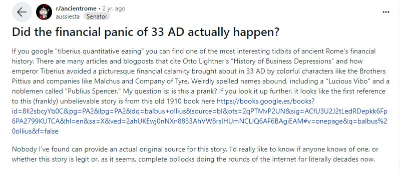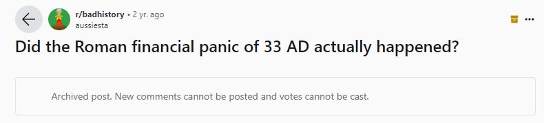 I chose Reddit because I’m a long-time, if frustrated, user (u/aussiesta) and I knew there are plenty of obsessives with time on their hands there and I was very suspicious about what appeared to be a very neat tale about Tiberius and a Roman financial panic in 33 AD. So I put up a call for help (notice the typo in the headline, that Reddit won’t allow correction for):