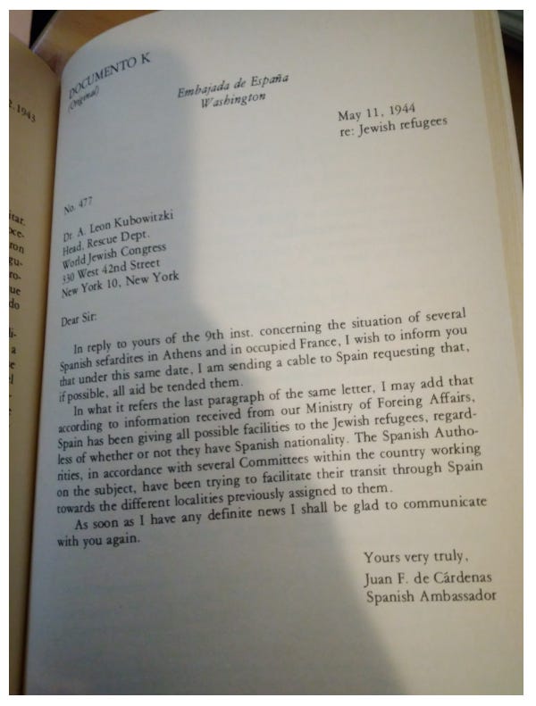 Meanwhile, the Spanish ambassador in Washington, Juan F. de Cárdenas, under pressure from Jewish communities to save threatened Jews in Europe, responded to one of such requests, in 1944, as follows (in English with a typo in the original):