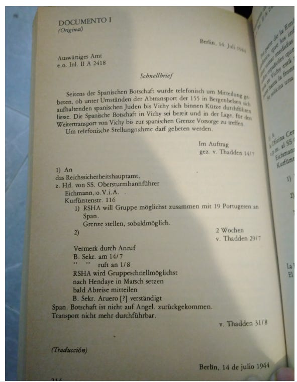 In this German-language document included in the appendix of Avni's book, German authorities notify their acceptance of the Spanish efforts to remove Spanish citizens from the Bergen-Belsen concentration camp: