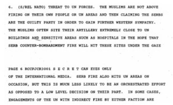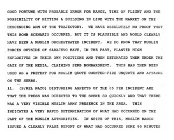 A particularly beloved tactic of the Bosniak side was triggering such false flag incidents in Sarajevo, in full view of international media: “We know that the Muslims have fired on their own civilians and the airfield in the past in order to gain media attention,” a memo concluded. A later memo observes, “Muslim forces outside of Sarajevo have, in the past, planted high explosives in their own positions and then detonated them under the gaze of the media, claiming Serb bombardment. This has then been used as a pretext for Muslim ‘counter-fire’ and attacks on the Serbs.”