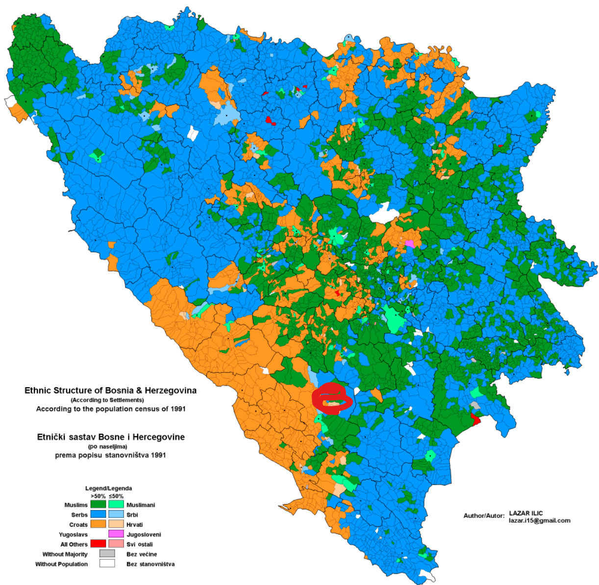 (Mostar: notice the minaret to the right. Croats — Catholics — live on the left bank of the river; Bosniaks — Muslims — on the right side. Mostar is the little red circle on the ethnic map of Bosnia, circa 1991, below:)