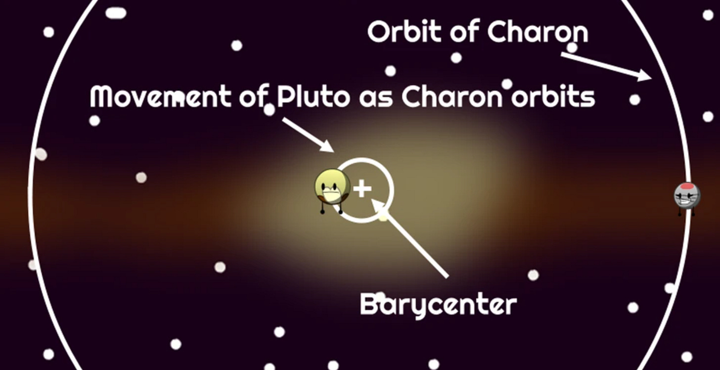 (Please click here and read this essay in the Substack page if your email reader won’t let you see the GIF animation with the two planets spinning around the barycenter.)