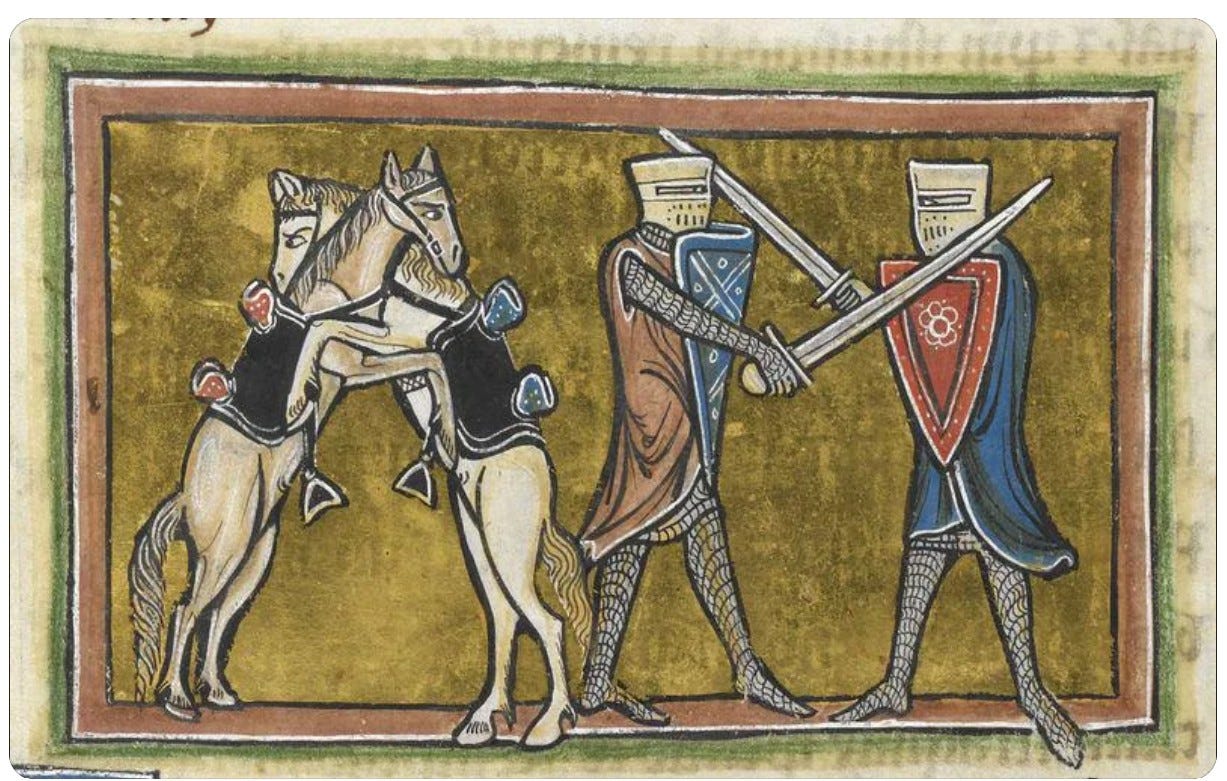 Duels are a near-myth of the Middle Ages. There were duels, to be sure, but deadly encounters between men trying to defend their honor or reputation weren’t as common as later authors led everyone to believe.