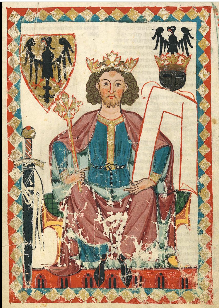Frederick’s ambitions, which he passed on to his son with his throne, were great and had a claim to universal dominion based on the Medieval notion that Holy Roman Emperors, and not the stupid Byzantine Greeks, were the true heirs of Rome; this is something I’ve discussed before: